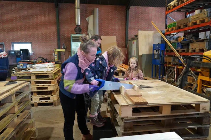 Gamle brædder og lægter fra genbrugspladsen bliver i løbet af et par timer forvandlet til fuglekasser, reoler eller et par stylter, som glade borgere efterfølgende tager med hjem. Og det er borgerne selv, der svinger sav, hammer og skruemaskiner.